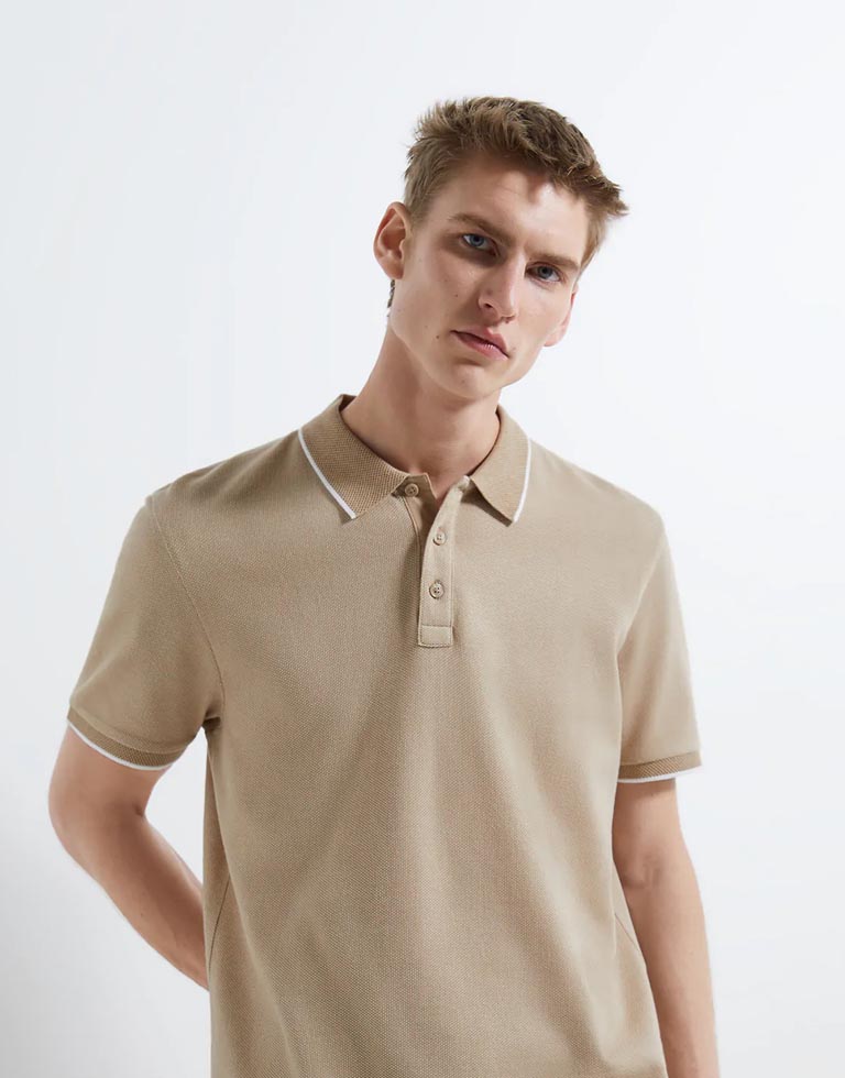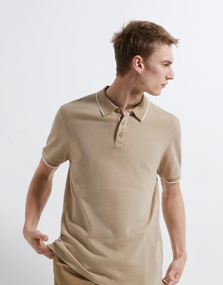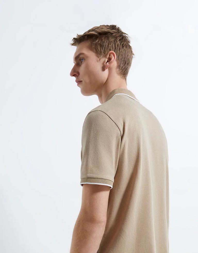 Polo shirt featuring a shirt collar, short sleeves with ribbed cuffs, side vents at the hem and a henley button placket.
